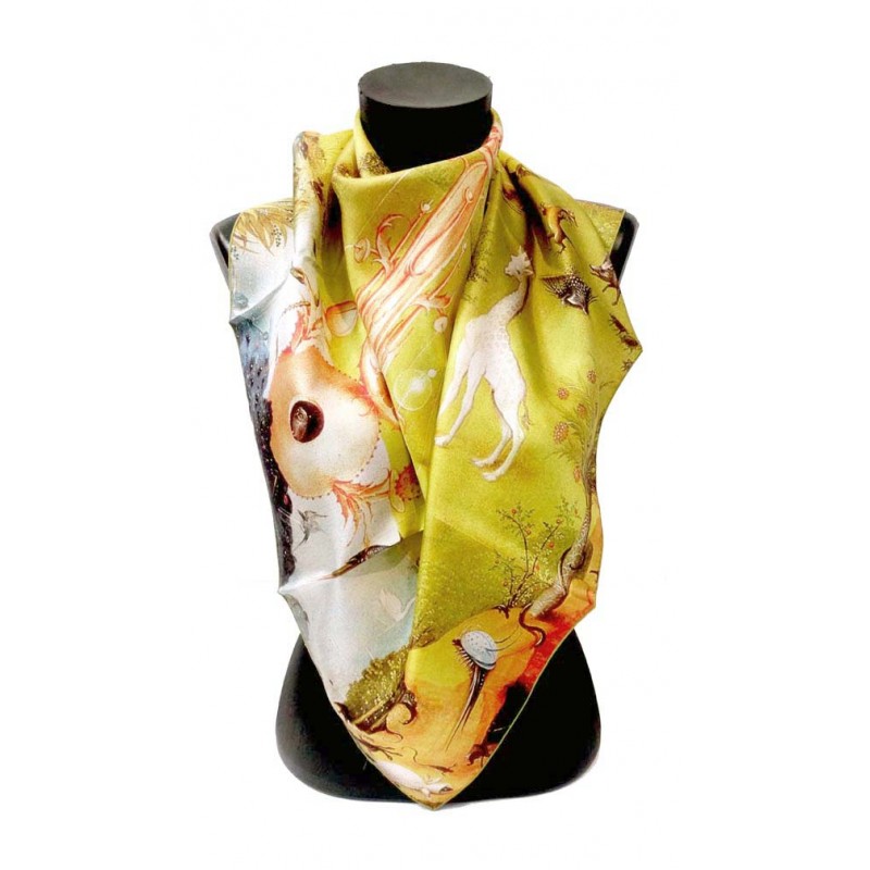 « Le Jardin des délices » est une peinture à l'huile sur bois du peintre néerlandais Jérôme Bosch (1450-1516), appartenant à la période des primitifs flamands. L'œuvre est structurée en triptyque, format souvent utilisé par les peintres du début du XVe siècle jusqu'au début du XVIIe siècle dans la partie septentrionale de l'Europe. Elle est le plus souvent datée de 1494 à 1505, bien que des chercheurs en avancent la création jusqu'aux années 1480. L’un des plus énigmatiques et les plus complexes du peintre néerlandais Jérôme Bosch, qui le réalisa dans la dernière partie de sa vie, ce triptyque est un chef-d’œuvre majeur de la Renaissance nordique. Le panneau de gauche, duquel nous avons repris des détails pour créer nos foulards et cravates, est consacré au Paradis, avec la création d’Adam et Eve, et la source de la Vie.