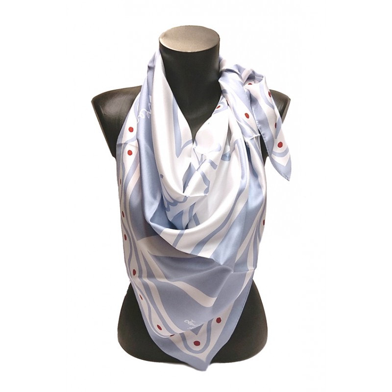 | Coloris | Fond bleu ciel, motifs blanc, pois rouge brique |