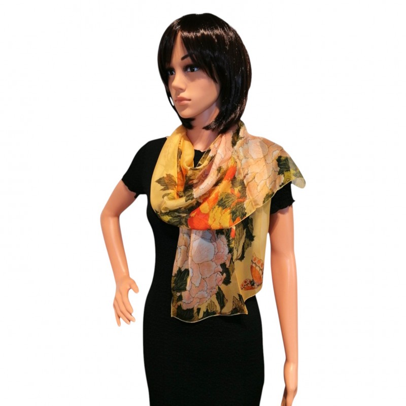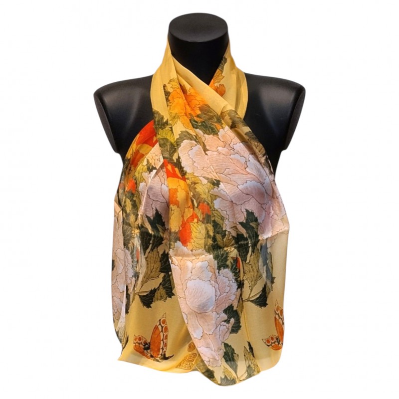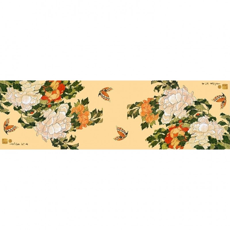 Katsushika Hokusai (1760-1849) est l'artiste japonais le plus célèbre au monde, peintre, dessinateur spécialiste de l’ukiyo-e (estampe) et graveur. Son œuvre influença de nombreux artistes européens, en particulier Gauguin, Van Gogh et Monet. Il est parfois vu comme le père du manga, mot qu’il a inventé et qui signifie à peu près «esquisse spontanée». L'artiste travaille le rose, le vert et l'orange dans cette œuvre aux traits fins, qui est, à l'origine, une estampe conservée par le Chicago Art Institute. Ces couleurs, délicatement nuancées par des dégradés ou radicalement contrastées par des teintes plus sombres, apportent du volume et de la vie à ces pivoines. Un papillon tournoyant autour des fleurs contribue à accentuer l'idée de mouvement et rend la composition poétiquement animée. Une élégante harmonie subtilement aérienne se dégage ce touchant tableau, inspiré par la nature.