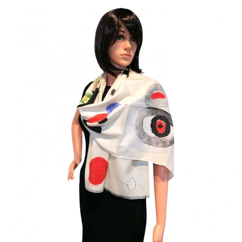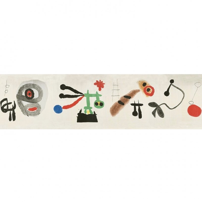 Impression sur soie (415 x 10000 mm). Roulé, impression en couleurs d'une aquarelle originale de Joan Miró effectuée dans les ateliers d'Aimé Maeght sur une soie des soyeux Brochier à Lyon. Boîtier en palissandre par Antoine Brac de la Perrière (non signé), avec le nom de l'artiste en marqueterie multicolore, avec la clé. Provenance: Jean Brochier. Tirage limité à 50 exemplaires, celui-ci hors commerce et non signé. Publication de grand luxe et d'une grande prouesse technique (le rouleau mesure en effet 10 mètres de long) dont le défi fut relevé par le soyeux lyonnais Jean Brochier. Le résultat avec ses couleurs éclatantes sur un tissu de très grande qualité parle de lui-même. Exemplaire personnel de Jean Brochier auquel est jointe une lettre autographe signée de Joan Miró (sur son papier à en-tête) rédigée lors de la production du Makemono. "Tous vos techniciens ont très bien compris et saisi l'esprit dans lequel il fallait travailler. Veuillez avoir l'amabilité de me tenir au courant de tous les nouveaux résultats que vous obtiendrez".