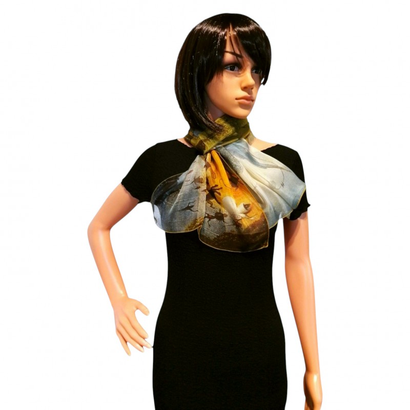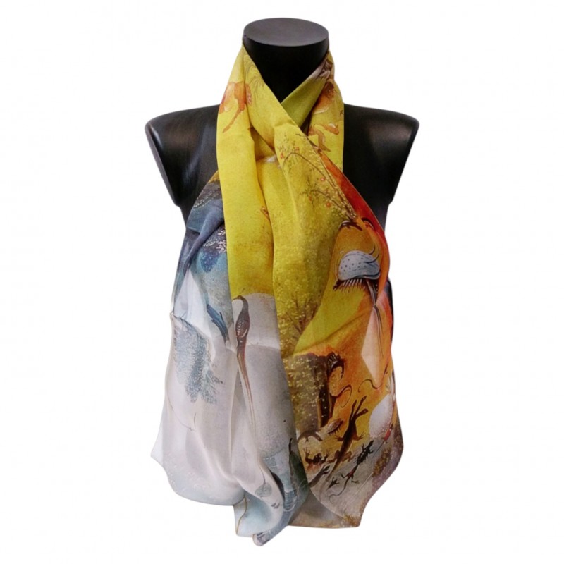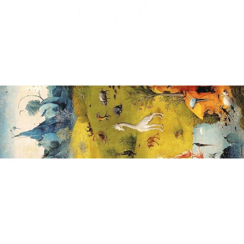 « Le Jardin des délices » est une peinture à l'huile sur bois du peintre néerlandais Jérôme Bosch (1450-1516), appartenant à la période des primitifs flamands. L'œuvre est structurée en triptyque, format souvent utilisé par les peintres du début du XVe siècle jusqu'au début du XVIIe siècle dans la partie septentrionale de l'Europe. Elle est le plus souvent datée de 1494 à 1505, bien que des chercheurs en avancent la création jusqu'aux années 1480. L’un des plus énigmatiques et les plus complexes du peintre néerlandais Jérôme Bosch, qui le réalisa dans la dernière partie de sa vie, ce triptyque est un chef-d’œuvre majeur de la Renaissance nordique. Le panneau de gauche, duquel nous avons repris des détails pour créer nos foulards et cravates, est consacré au Paradis, avec la création d’Adam et Eve, et la source de la Vie.